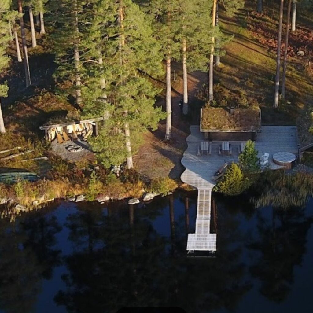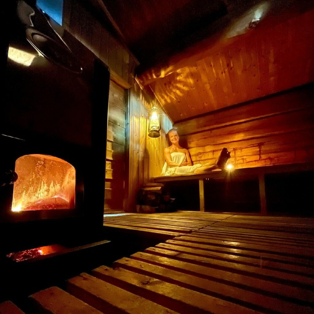 Vår vedfyrte badstue og badestamp er ved siden av bålplassen, ved vannkanten til Sæterlisjøen. Når det blir mørkt, belyser vi hele området med levende lys slik at du helt uforstyrret kan nyte månen og stjernehimmelen.