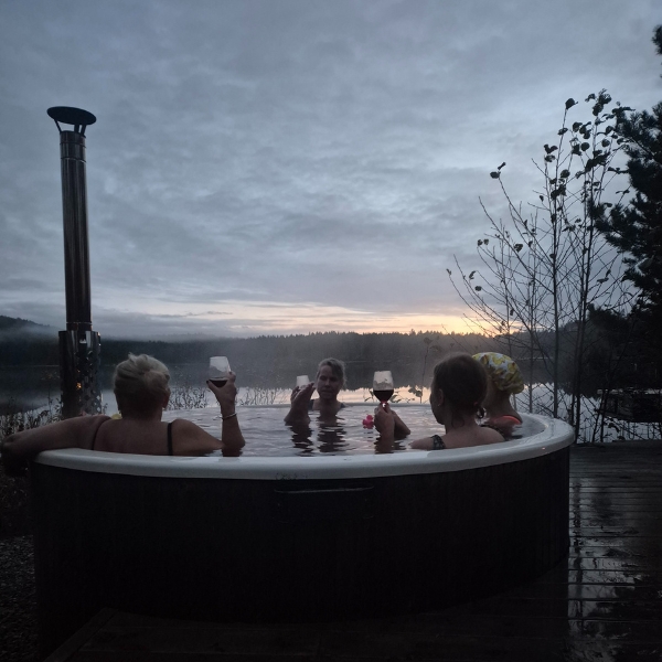 Badstuen blir varm på en time, mens det tar opptil 6 timer å varme opp badestampen – husk derfor å bestille det i god tid.